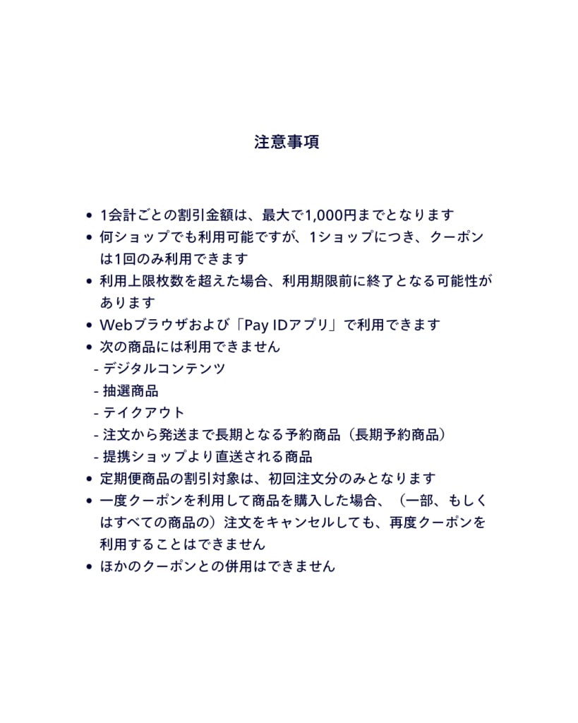 ・一度クーポンを利用して商品を購入した場合、(一部、もしくはすべての商品の)注文をキャンセルしても、再度クーポンを利用することはできません
