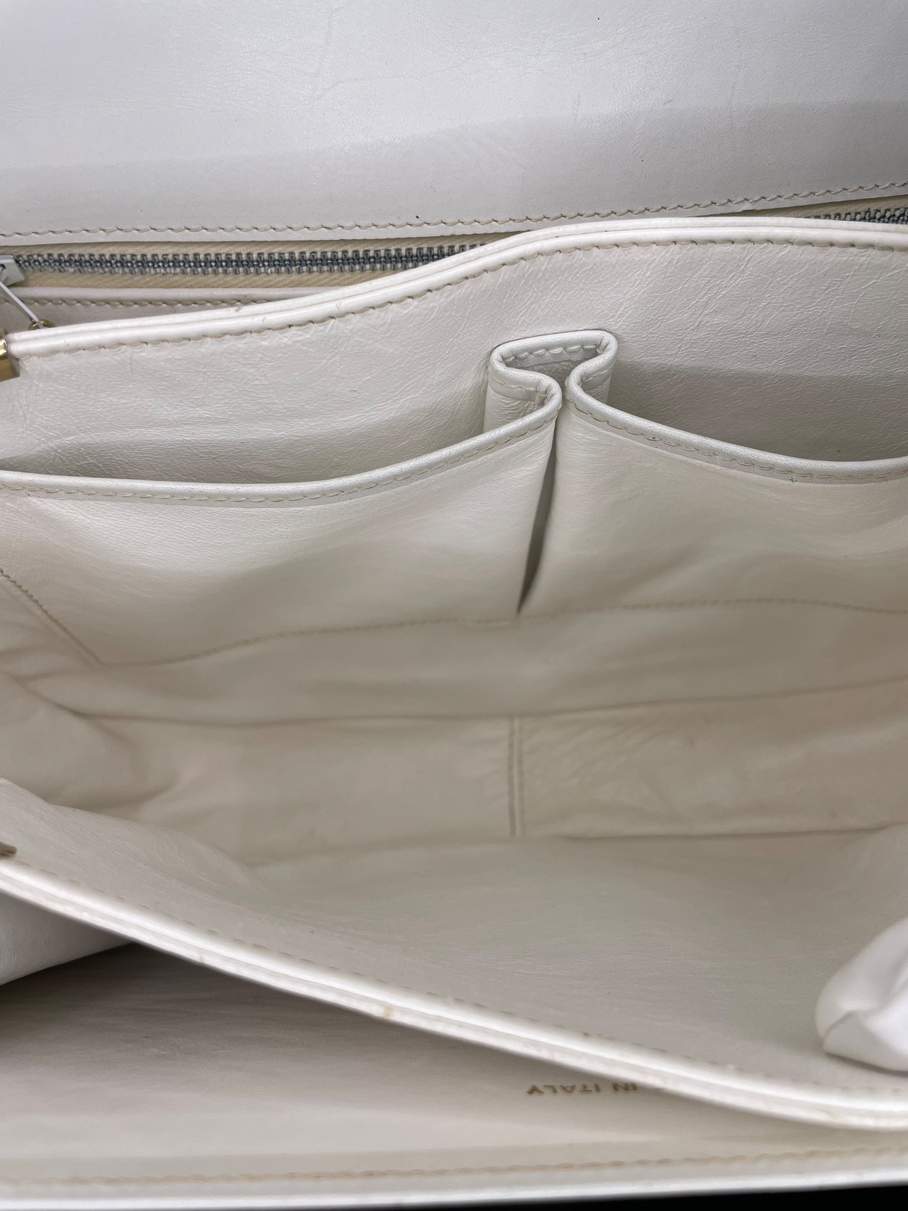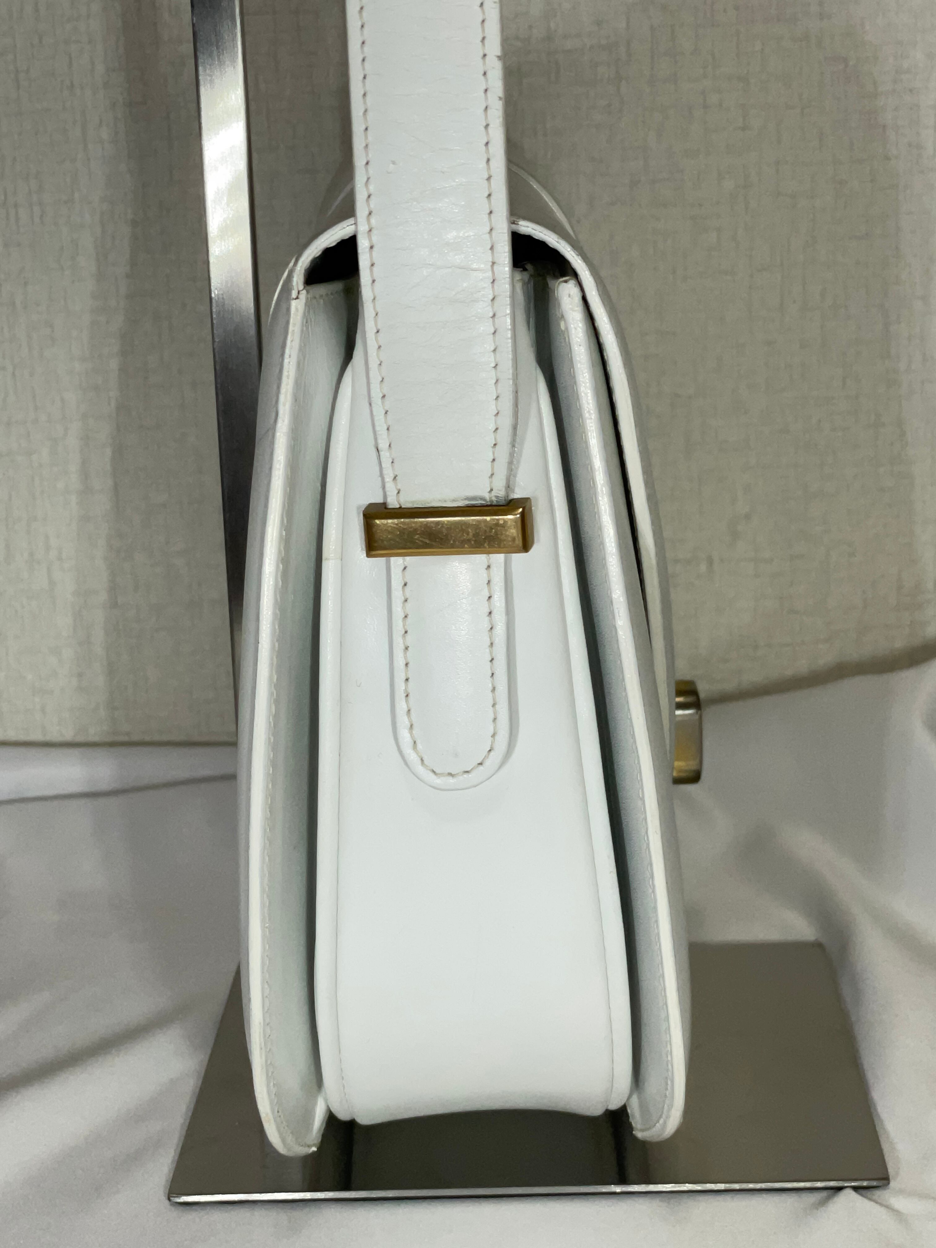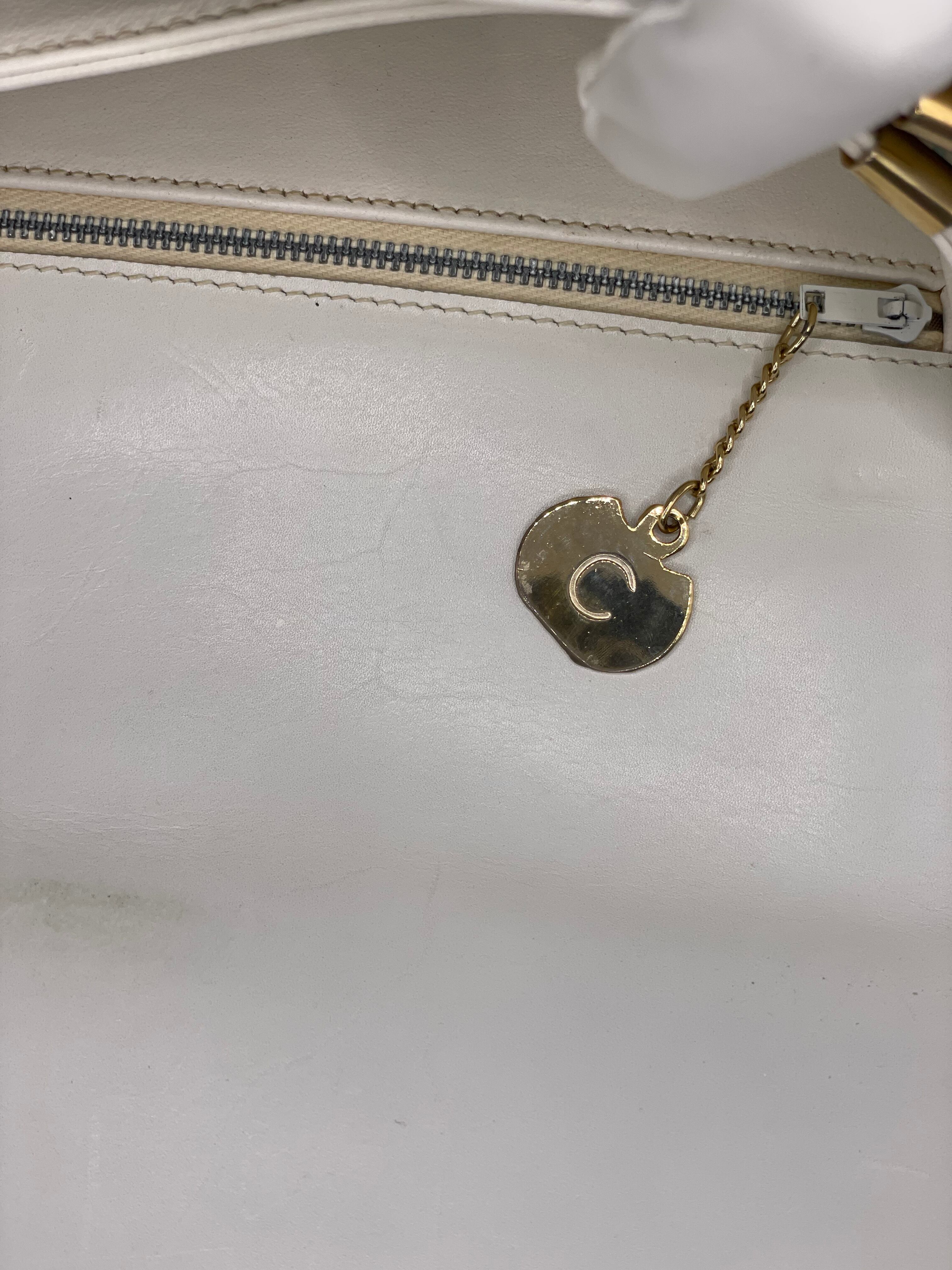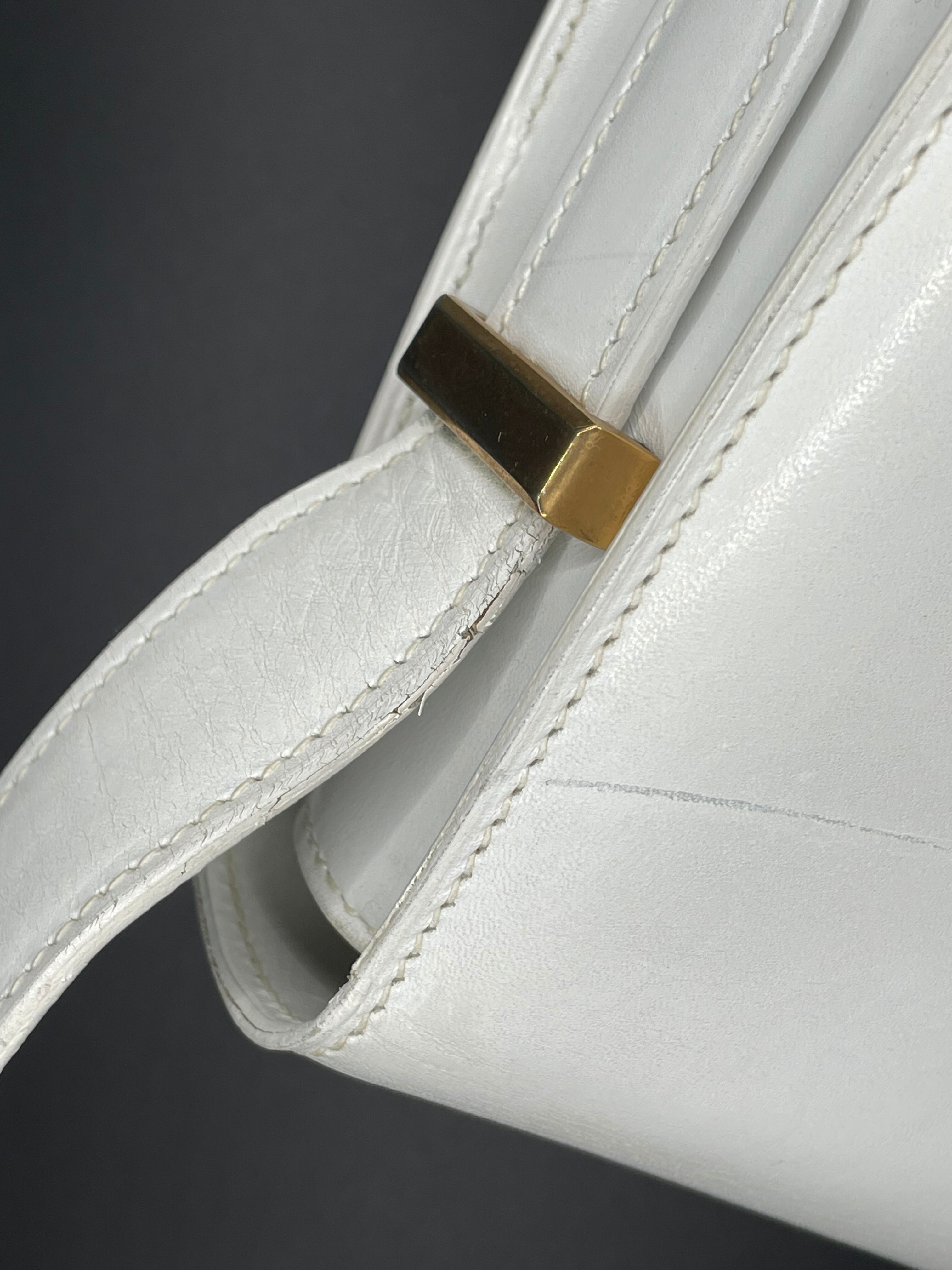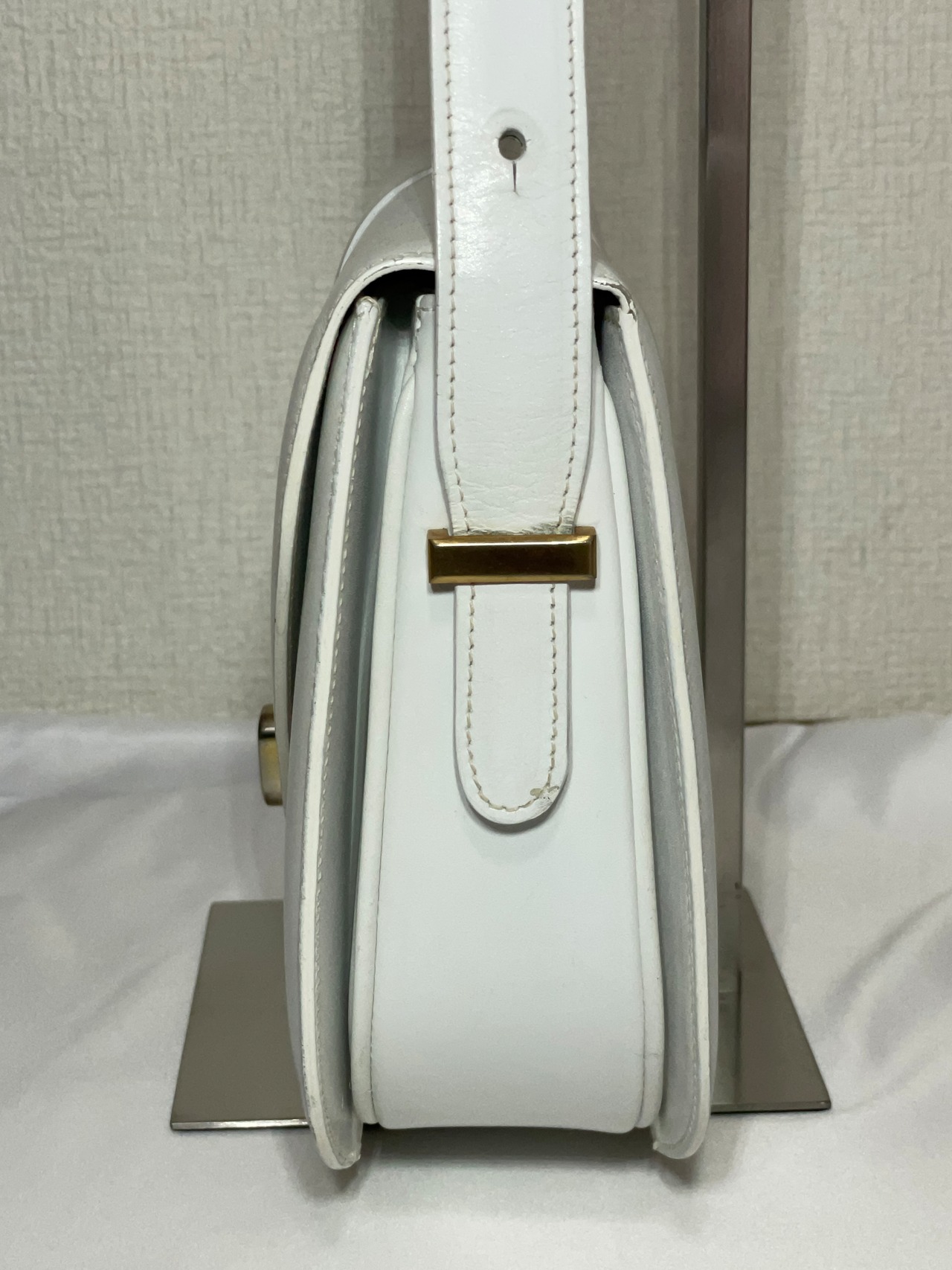 こちらは1980年代から90年代のCELINEのヴィンテージショルダーバッグです。現代の市場では滅多に出会えない稀少なホワイトレザーに、ゴールドの金具が映える、クラシカルな逸品です。