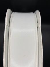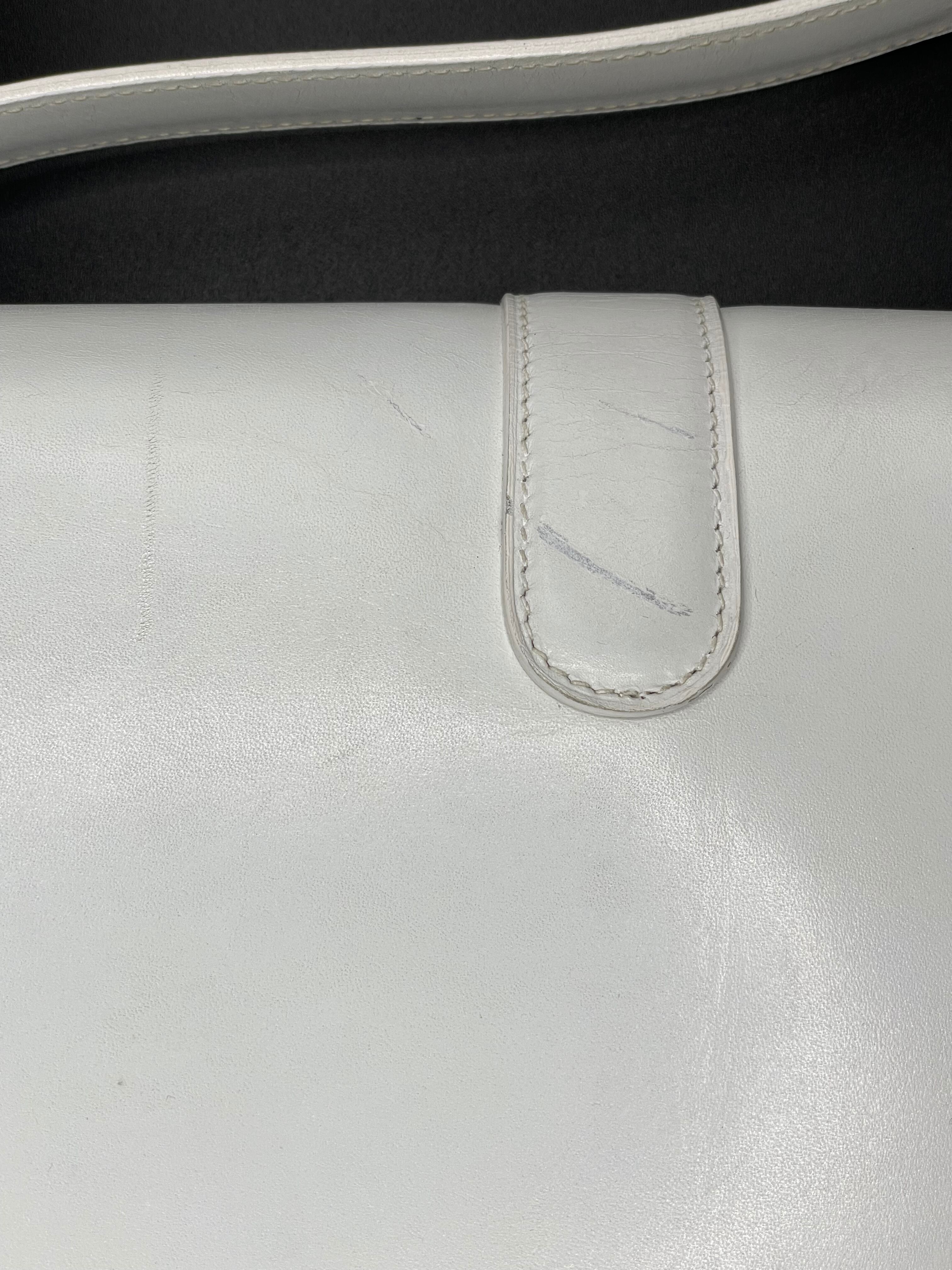 白いレザー全体にスレ、キズ、小キズが多数見られます。特にストラップ接続部や表面には、革の剥がれやひび割れが見られ、使用感はかなり強い状態です。